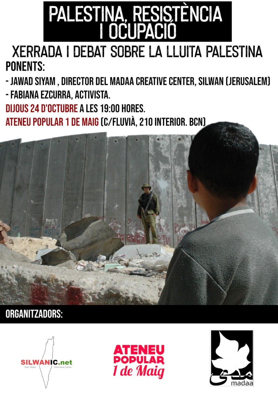 El passat 24 d’Octubre a les 19 h va tenir lloc a l’Ateneu Popular Primer de Maig (BCN) un important acte sobre la lluita del poble palestí. La xerrada sota el títol “PALESTINA, RESISTÈNCIA I… CRÒNICA DE L’ACTE SOBRE PALESTINA A L´ATENEU POPULAR 1R DE MAIG