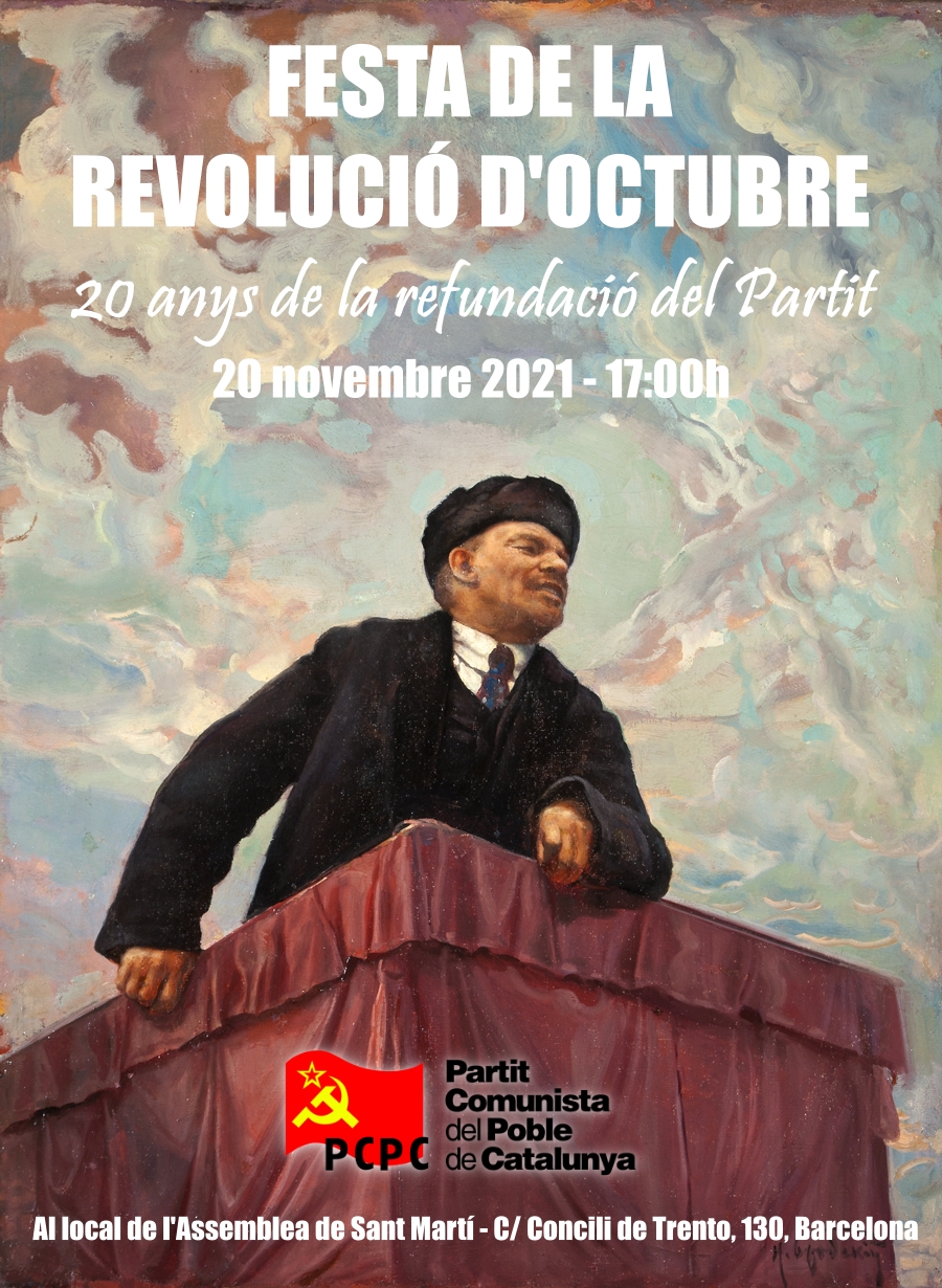 Dissabte dia 20 de novembre a les 17 h en el local de l’Assemblea de Sant Martí C/ Concili de Trento, 130, Barcelona. El Partit Comunista del Poble de Catalunya (PCPC) organitza un acte per commemorar el 104 aniversari de la revolució d’octubre… FESTA DE LA REVOLUCIÓ D’OCTUBRE