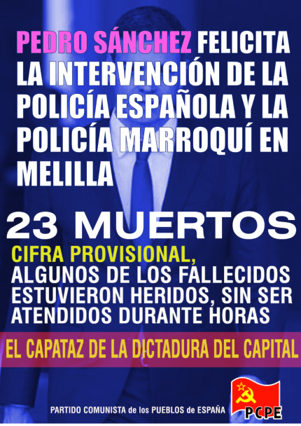 PCPC Barcelona El PCPC denuncia com no podia ser d’una altra manera la última tragèdia humana succeïda el passat 25 de juny a Melilla. La declaració que va fer el màxim dirigent “del govern més progressista espanyol” és inacceptable però alhora comprensible donat el context sociopolític en el que es troba immers L’Estat Espanyol. A pocs dies de […]