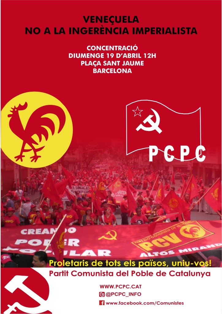 Concentració 19 d’abril a les 12 hores. Plaça Sant Jaume, Barcelona El Partit Comunista del Poble de Catalunya convoca a concentrar-se davant el Govern de la generalitat contra la ingerència imperialista a Veneçuela.