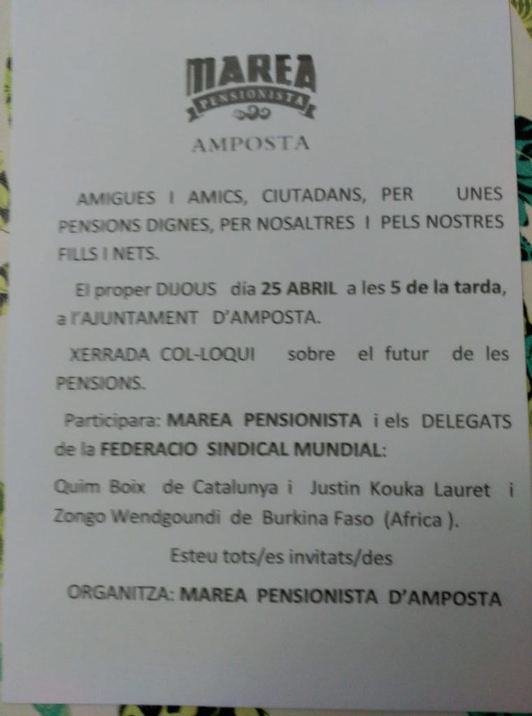 Convocatòria: Dijous 25 d’abril a les 17 hores a l’Ajuntament d’Amposta. Des del Partit Comunista del Poble de Catalunya us convidem a participar d’aquesta xerrada col·loqui sobre les pensions. Entre els ponents com a delegats de la Federació Sindical Mundial hi haurà el nostre camarada Quim Boix i els representants de Burkina Faso: Justin Koka […]