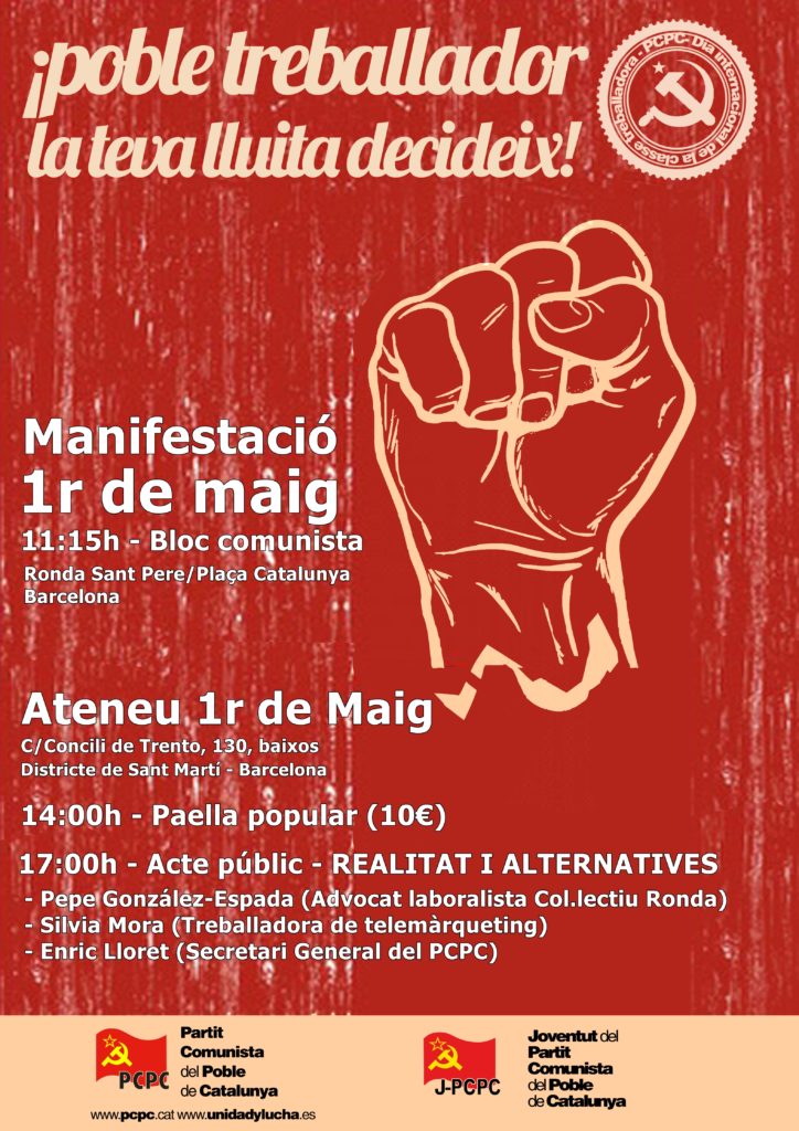 JORNADA 1r de MAIG 2018 A BARCELONA: MANIFESTACIÓ: 11:15h —> BLOC COMUNISTA PCPC-JOVENTUT PCPC. Ronda de Sant Pere cantonada Pl. Catalunya. DINAR POPULAR: 14h—> A l’Ateneu Popular 1 de Maig (Preu 10€). ACTE POLÍTIC: 17h—> REALITATS I ALTERNATIVES DE LA CLASSE OBRERA: Amb: Silvia MORA (Teleoperadora) Pepe GONZALEZ ESPADA (Advocat laboralista del Col.lectiu Ronda) Enric LLORET (Secretari […]
