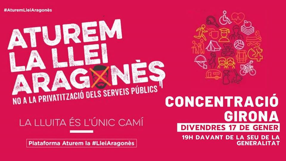 Lloc: Divendres 17 de gener a les 19 hores, davant la Seu de la Generalitat. A Girona també rebutgem la Llei Aragonès!No a la privatització i mercantilització dels serveis públics! Partit Comunista del Poble de Catalunya