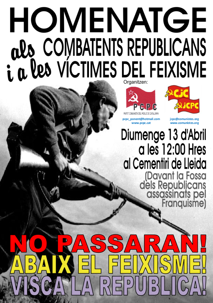 Com cada any el Partit Comunista del Poble de Catalunya (PCPC-Ponent) i els JCPC-CJC farem l’homenatge als combatents republicans i a les víctimes del feixisme al cementiri de Lleida. En l’acte es farà l’ofrena floral i varis parlaments. El PCPC fa una crida a la classe obrera i popular a participar en aquests tipus d’actes […]