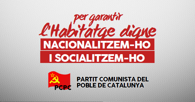 El Partit Comunista del Poble de Catalunya (PCPC) considerem totalment intolerable que el bé bàsic més important, l’habitatge, estigui en mans privades, principalment de la banca i grans immobiliàries. L’habitatge, la casa, ha de ser un bé públic, blindat contra l’especulació i contra la seva pèrdua. Actualment, la banca gestiona el 80-90% del mercat de l’habitatge.