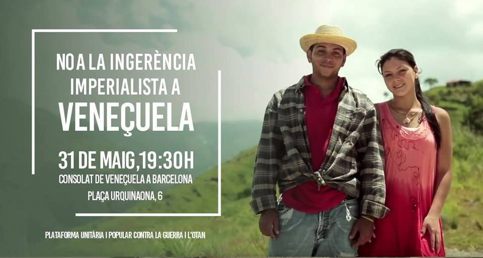 El Partit Comunista del poble de Catalunya (PCPC) i la Joventut del PCPC, organitzacions cofundadores de la Plataforma Unitària i Popular contra la Guerra i l’OTAN, convidem a tota la seva militància, simpatitzants i amics, així com a la classe treballadora de Catalunya, a participar de la concentració en defensa de la sobirania de Veneçuela convocada per aquesta Plataforma el proper dia 31 de maig, a les 19:30h a la Plaça Urquinaona, 6, de Barcelona (a les portes del Consolat Veneçolà).