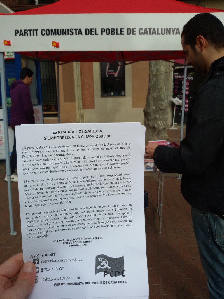 El Partit Comunista del Poble de Catalunya al Clot-Camp de l’Arpa continua amb la seva campanya contra els atacs sistemàtics dels monolopis a la classe obrera que demostren que l’Estat és una eina de poder de la classe dominant. En aquest cas es basava en l’augment del preu de l’electricitat, el manifest repartit era: “Els passats […]