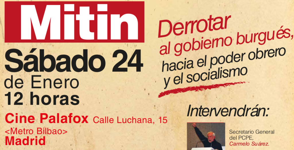 Aquest proper dissabte 24 de gener, el nostre Partit germà -el PCPE- realitzarà un nou míting amb les intervencions del Secretari General del PCPE, el Secretari General dels CJC i de tot un seguit de representants de treballadors en conflicte d’arreu del país.