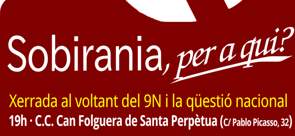 El proper acte del Partit Comunista del Poble de Catalunya tindrà lloc al Centre Cívic de Can Folguera (Santa Perpètua de la Mogoda). En aquest tractarem la qüestió nacional i quina és la postura del Partit davant de l’anomenat procés “sobiranista”. Ens veiem tots i totes a les 19h del 31 d’octubre a Santa Perpètua!